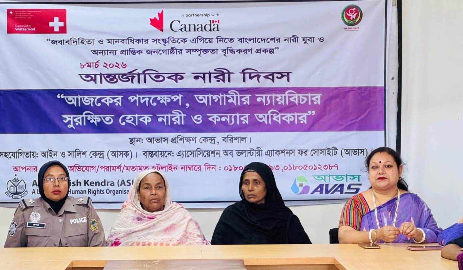 আভাস বাস্তবায়নে “আইন ও সালিশ কেন্দ্র (আসক) সুইজারল্যান্ড দূতাবাস এবং গ্লোবাল অ্যাফেয়ার্স কানাডা (GAC)-এর সহায়তায় নাগরিকতা: সিভিক এনগেজমেন্ট ফান্ড (CE F) প্রোগ্রামের অধীমনে EngageNow প্রকল্পটি বাস্তবায়নে আজ রবিবার আন্তর্জাতিক নারী দিবস ২০২৬ উদযাপন করা হয়েছে।